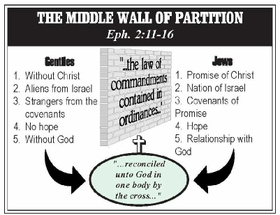 Eph 2:11-16 Wherefore remember, that ye being in time past Gentiles in the flesh, who are called Uncircumcision by that which is called the Circumcision in the flesh made by hands; 12. That at that time ye were without Christ, being aliens from the commonwealth of Israel, and strangers from the covenants of promise, having no hope, and without God in the world: 13. But now in Christ Jesus ye who sometimes were far off are made nigh by the blood of Christ. 14. For he is our peace, who hath made both one, and hath broken down the middle wall of partition between us; 15. Having abolished in his flesh the enmity, even the law of commandments contained in ordinances; for to make in himself of twain one new man, so making peace; 16. And that he might reconcile both unto God in one body by the cross, having slain the enmity thereby: